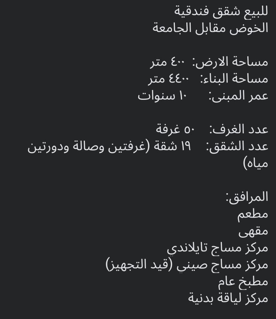 عدد الشقق: ١٩ شقة (غرفتين وصالة ودورتين مياه)