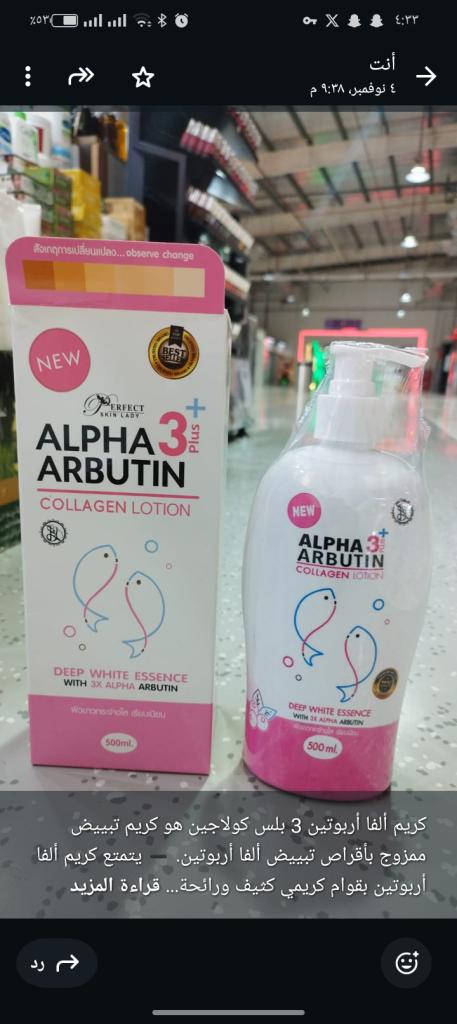 كريم ألفا أربوتين 3 بلس كولاجين هو كريم تبييض ممزوج بأقراص تبييض ألفا أربوتين. ➖ يتمتع كريم ألفا أربوتين بقوام كريمي كثيف ورائحة طبيعية ومغرية. ➖ ذو قدرة على الامتصاص بشكل خاص عند ملامسته لسطح الجلد. -للقضاء على التصبغات الداكنة التي تسبب البشرة الداكنة والكلف والبقع العمرية