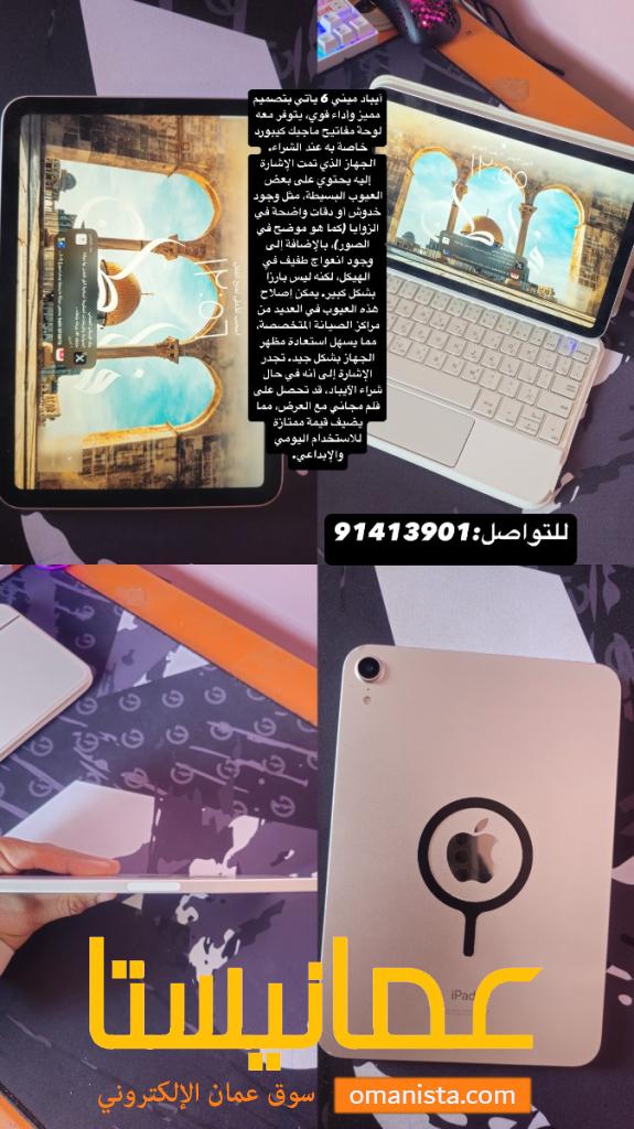 آيباد ميني 6 يأتي بتصميم مميز وأداء قوي، يتوفر معه لوحة مفاتيح ماجيك كيبورد خاصة به عند الشراء. الجهاز الذي تمت الإشارة إليه يحتوي على بعض العيوب البسيطة، مثل وجود خدوش أو دقات واضحة في الزوايا (كما هو موضح في الصور)، بالإضافة إلى وجود انعواج طفيف في الهيكل، لكنه ليس بارزاً بشكل كبير. يمكن إصلاح هذه العيوب في العديد من مراكز الصيانة المتخصصة، مما يسهل استعادة مظهر الجهاز بشكل جيد. تجدر الإشارة إلى أنه في حال شراء الآيباد، قد تحصل على قلم مجاني مع العرض، مما يضيف قيمة ممتازة للاستخدام اليومي والإبداعي.
