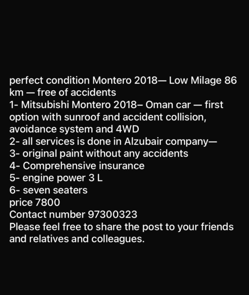 1- Mitsubishi Montero 2018– Oman car — first option with sunroof and accident collision, avoidance system and 4WD