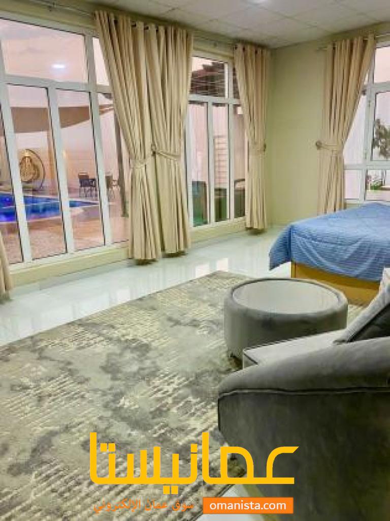 - صاله واسعة بواجهه زجاجية مطلة على حوض السباحة