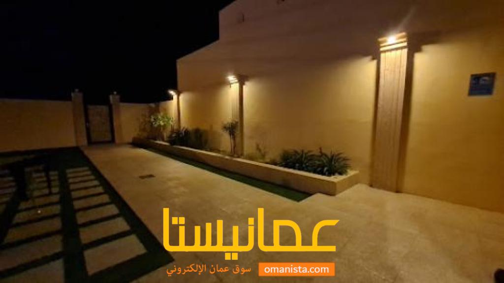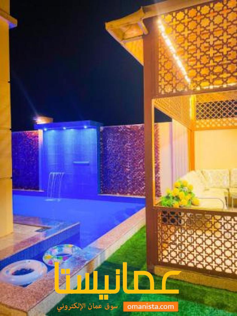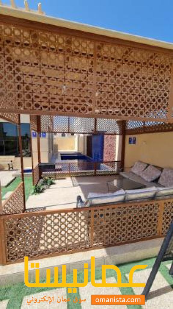 - جلسة خارجية مطلة على حوض السباحة مجهزة بأثاث راقي صممت بطاز حديث وبلمسة تراثية وإسلامية لتضفي مزيدا من الدفء والاستجمام.