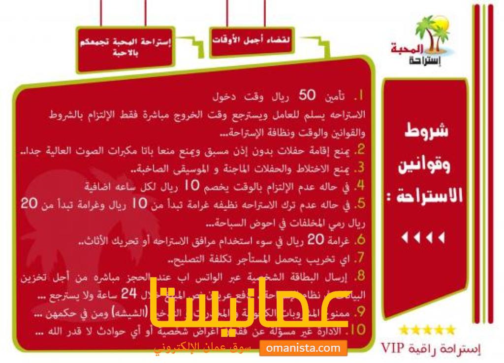- يضاف 50 ر.ع تأمين يسلم للعامل وقت دخول الاستراحه ومسترجع وقت الخروج مباشرة فقط الإلتزام بالشروط والقوانين