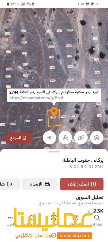 _ للبيع ارض سكنية ممتازة ، في بركاء في الفليج المعمورة ، حواليها منازل قائمة ، رقم القطعة (2744) .