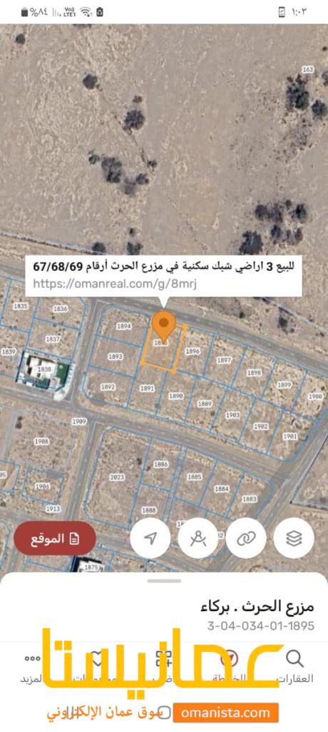 _ للبيع 3 أراضي شبك سكنية ممتازة ، في بركاء في مزرع الحرث ، بالقرب من منازل قائمة وأخرى على قيد الإنشاء .