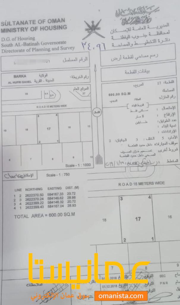 _ مساحة الأرض لكل قطعة : (600 م²) .