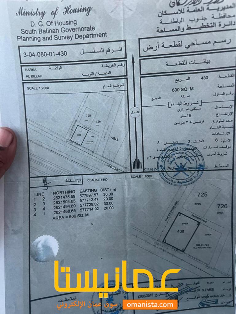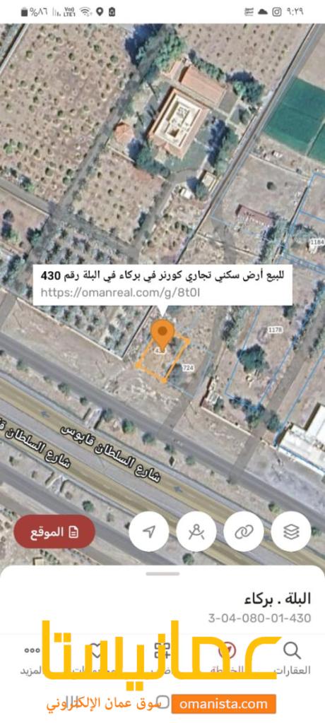 _ للبيع ارض سكنية تجارية كورنر ممتازة ، في بركاء في البلة ، رقم القطعة (430) .