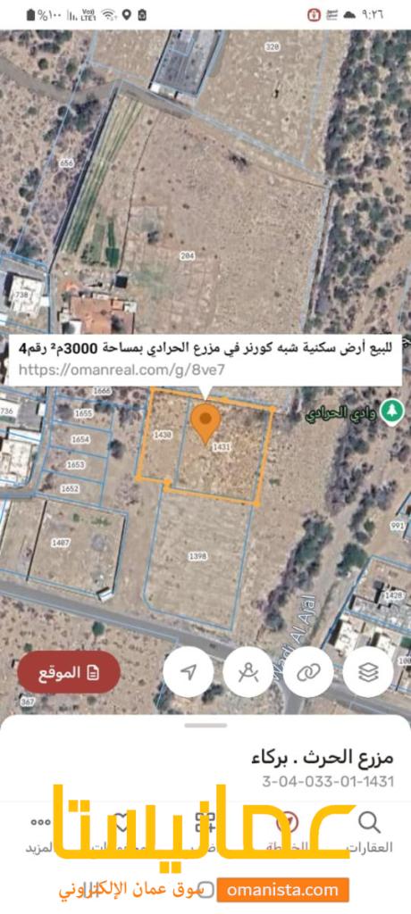 _ للبيع ارض سكنية شبه كورنر ممتازة ، في بركاء في مزرع الحرادي ، حواليها منازل قائمة ، رقم القطعة (4) .