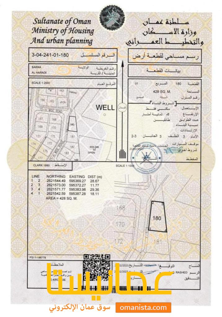 للبيع أرض سكنية مميزة في بركاء الحرادي ، رقم القطعة (180) .