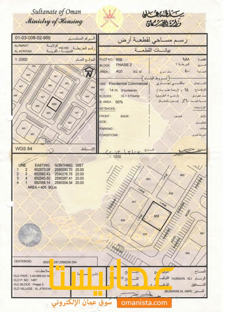 ارض سكنية تجارية مميزة في العامرات العتكية رقم القطعة 958 | سوق عُمانيستا 2026
