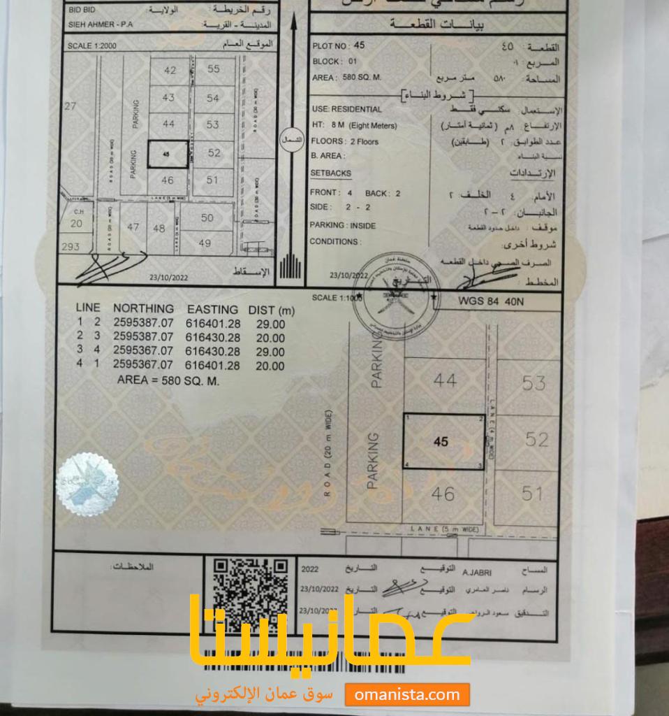 مساحة الأرض 580م² ، وسطية على شارع امامي عرضه 20 متر ، بالقرب من شركة مزون للكهرباء وقريبه من الشارع العام الخط المتجه إلى مسقط ، فرصة للإستثمار ، الارض مستوية ونظيفة ، حولها العديد من المنازل القائمة وأخرى قيد الإنشاء ، الخدمات متوفرة .