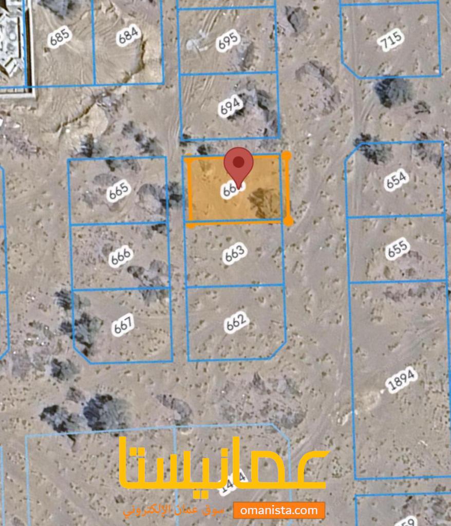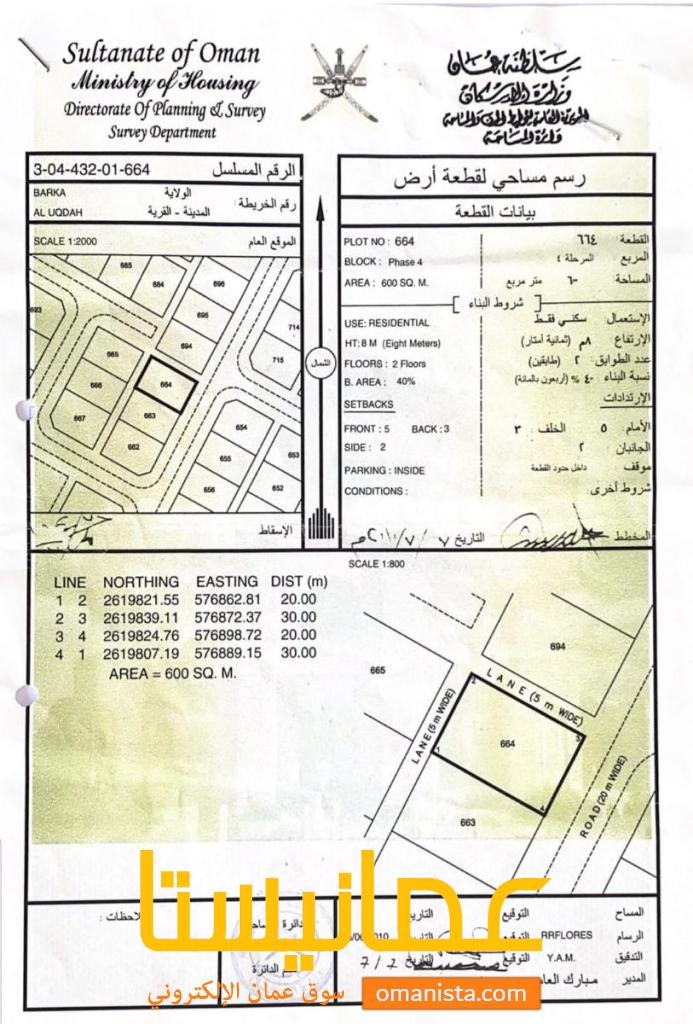 للبيع ارض سكنية ممتازة في بركاء العقدة الرابعة زاوية ، رقم القطعة (664) .