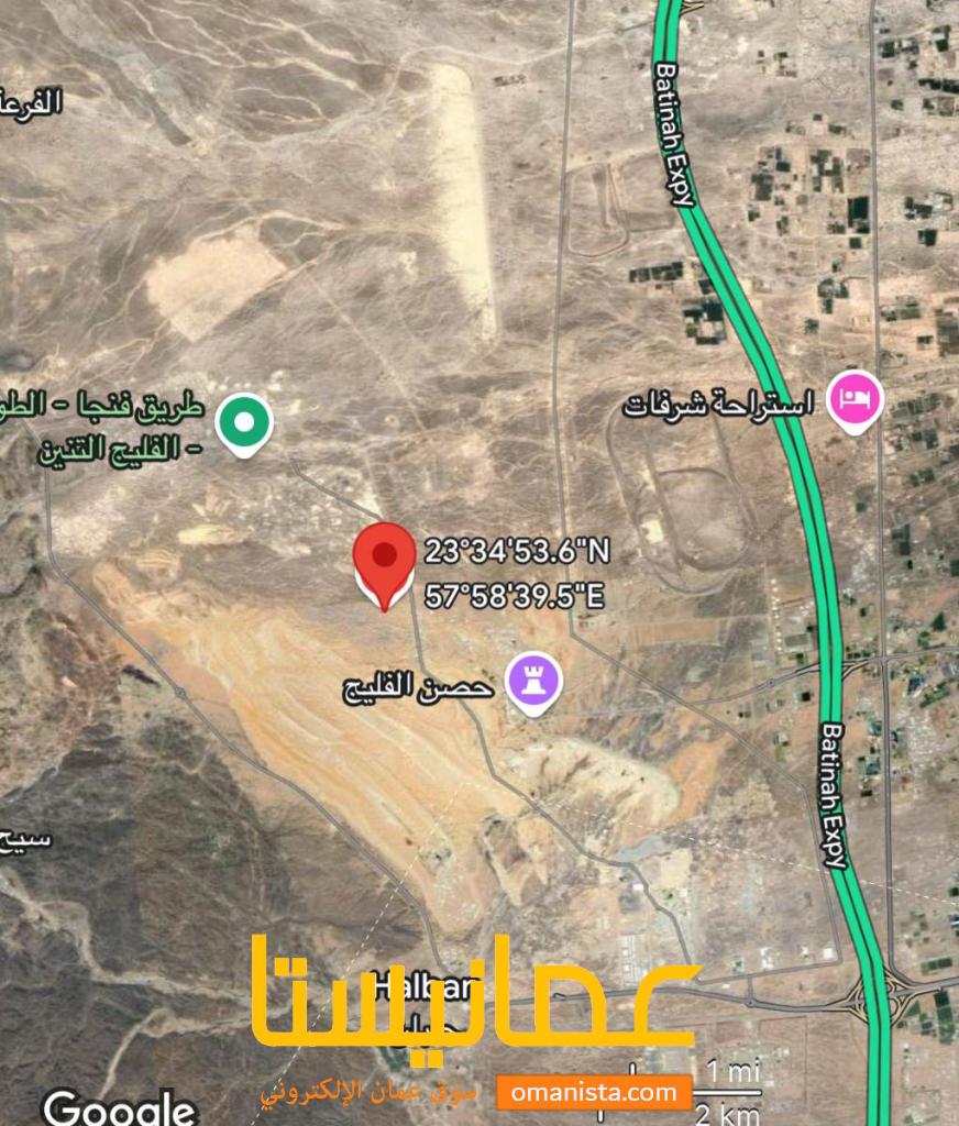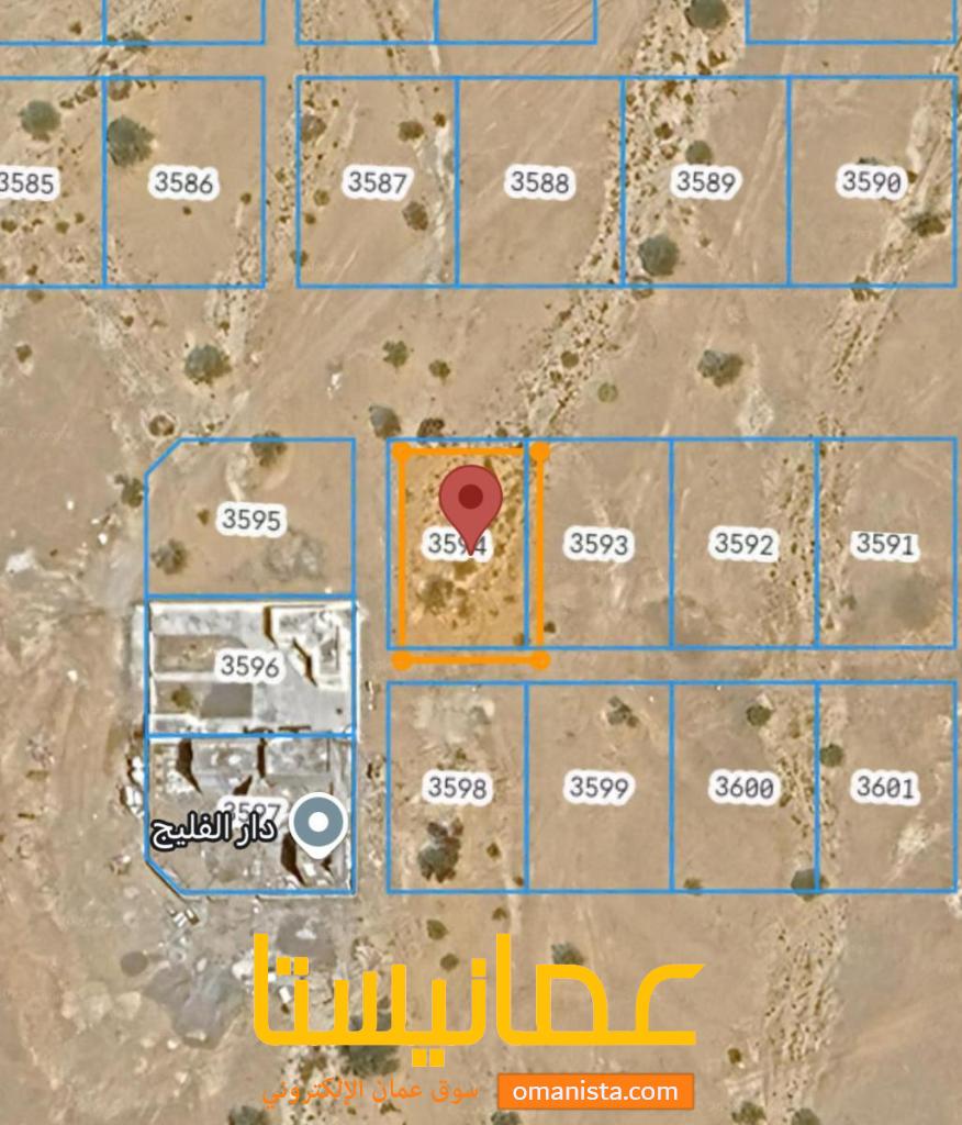 للبيع ارض سكنية ممتازة في بركاء الفليج المعمورة زاوية ، رقم القطعة (3594) .