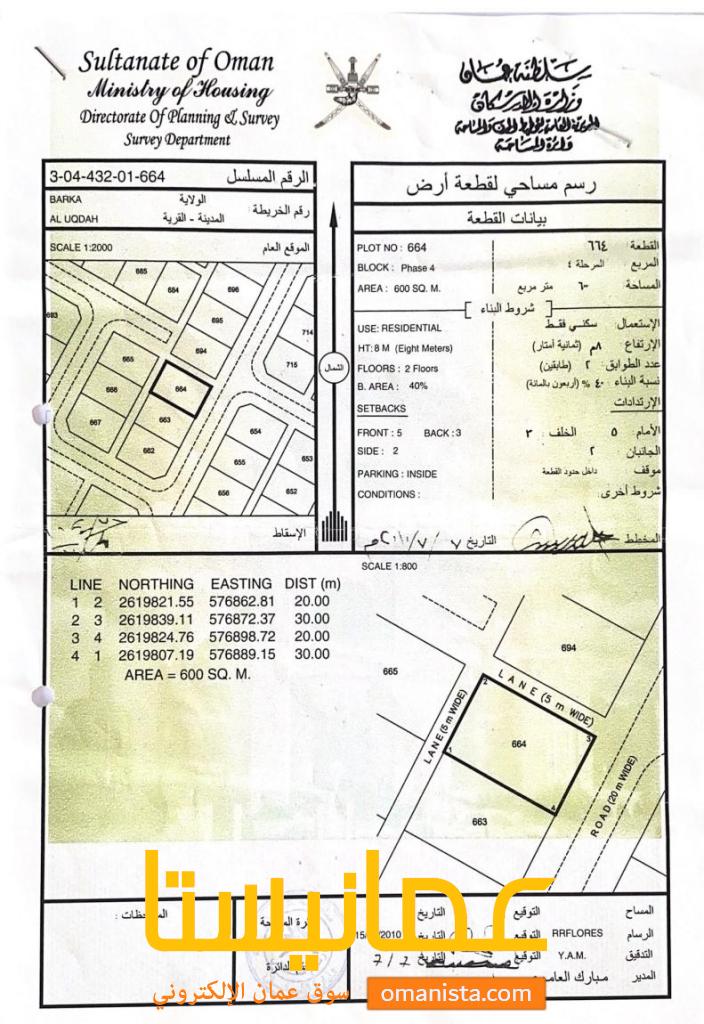 للبيع ارض سكنية ممتازة في بركاء العقدة 4 ، رقم القطعة (664) .