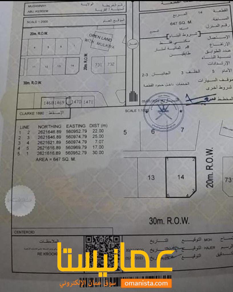 مساحة الارض 647 م² كونر مفتوحة من ثلاث جهات ، فرصة للأستثمار ، الارض مستوية وحولها بعض المنازل القائمة و اخرى قيد الانشاء ، الخدمات متوفرة .