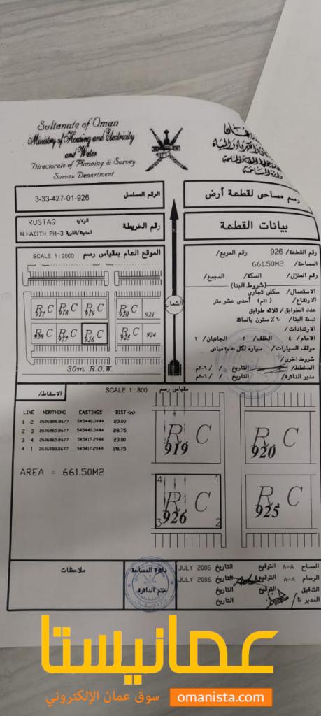 للبيع ارض سكنية تجارية مميزة في الرستاق منطقة دارس ، رقم القطعة (926) .