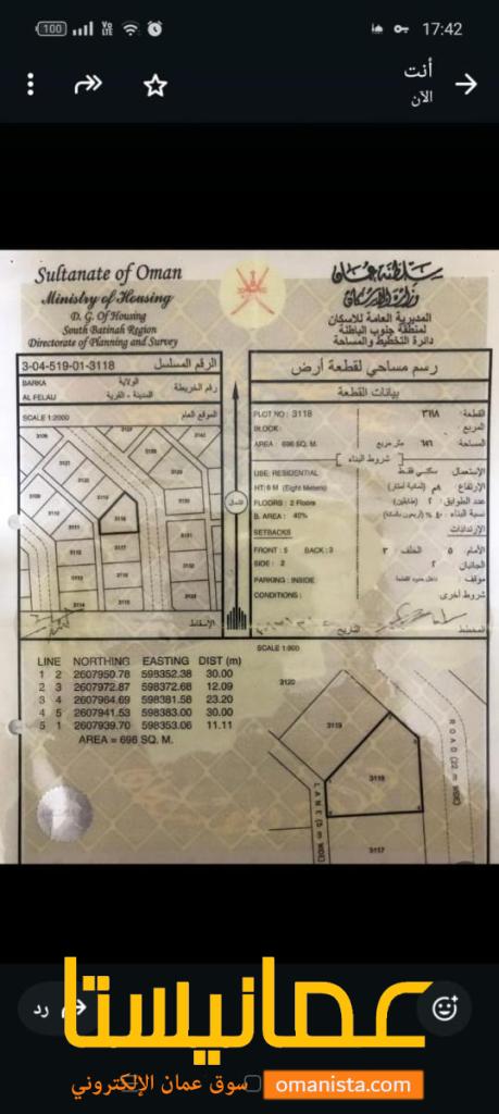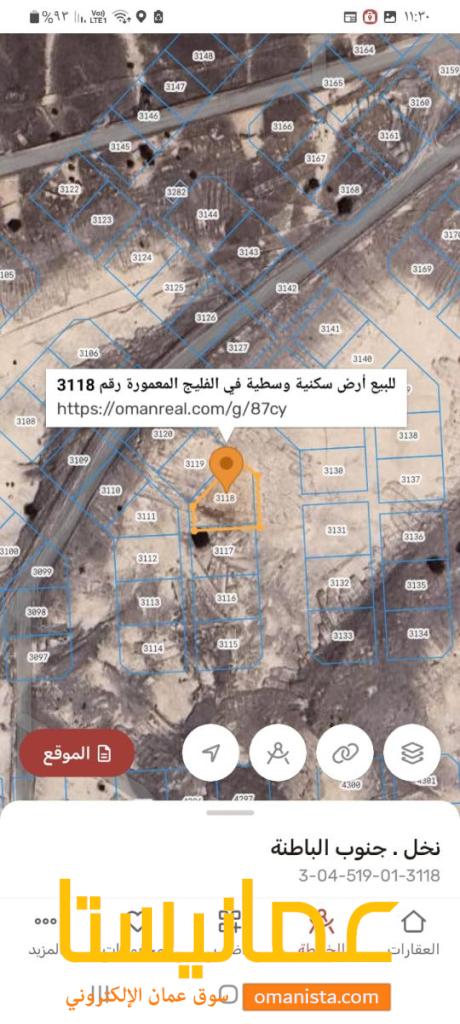 _ للبيع ارض سكنية وسطية ، في بركاء في الفليج المعمورة ، حواليها منازل قائمة ، رقم القطعة (3118) .
