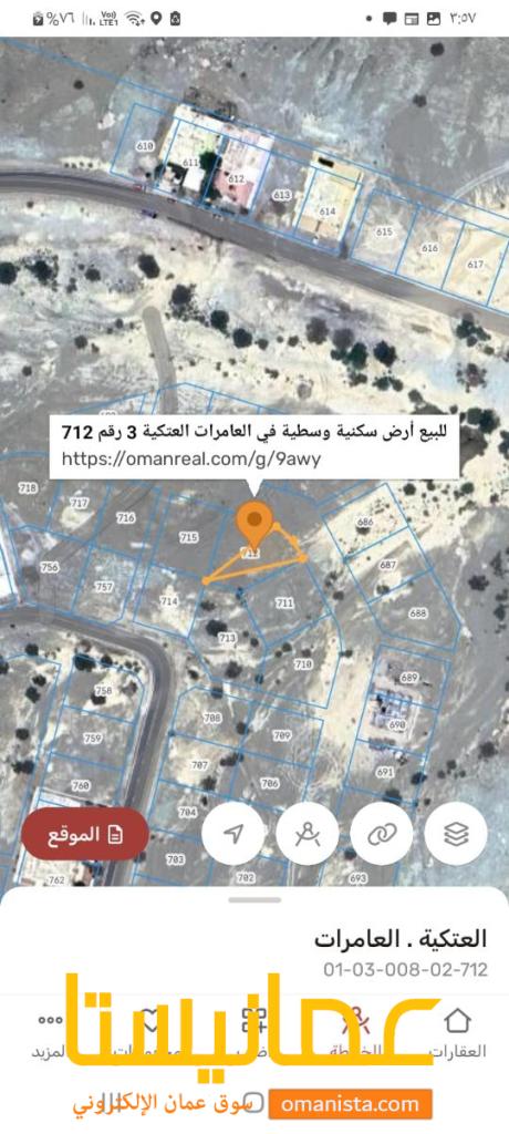 _ للبيع ارض سكنية وسطية ، في العامرات في العتكية الثالثة ، بالقرب من منازل قائمة ، رقم القطعة (712) .