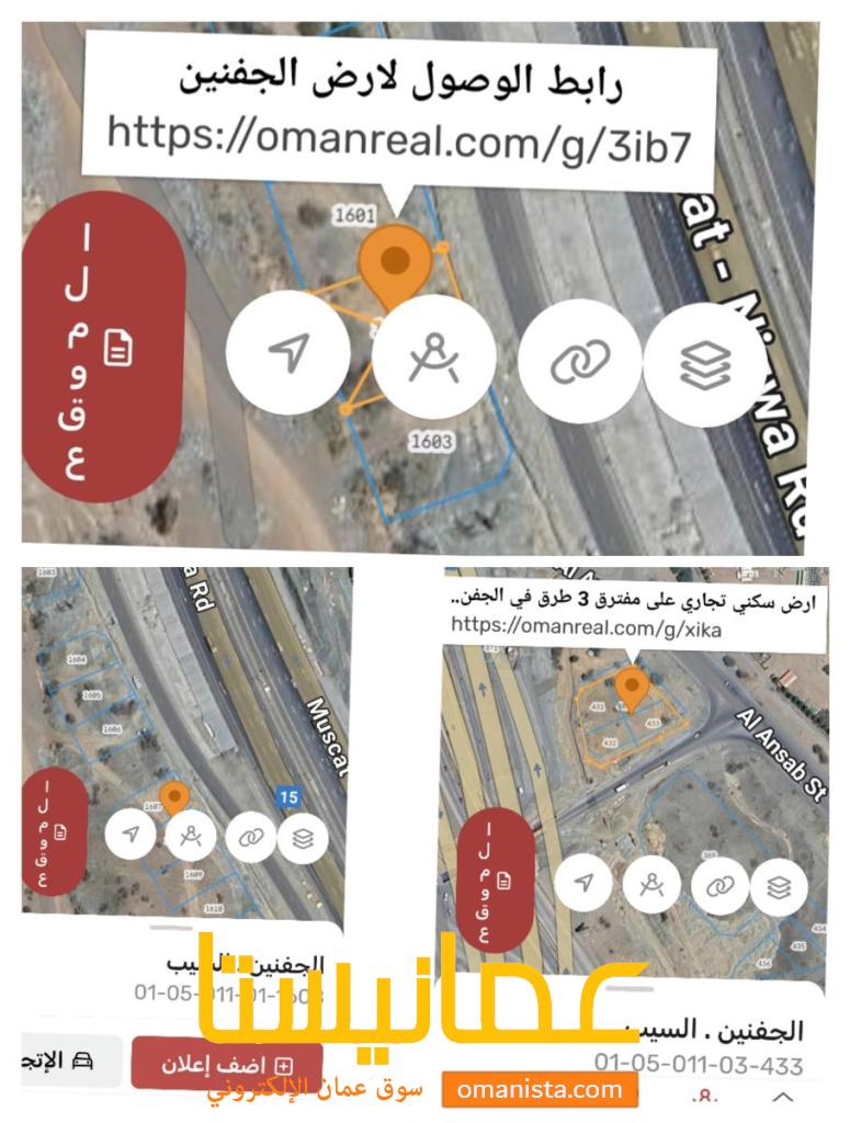 ? أرض سكني تجاري في *~الجفنين* على الخط الأول من الشارع العام " نزوى مسقط " وعلى الخط الاول من الطريق السريع " الجفنين الانصب "
