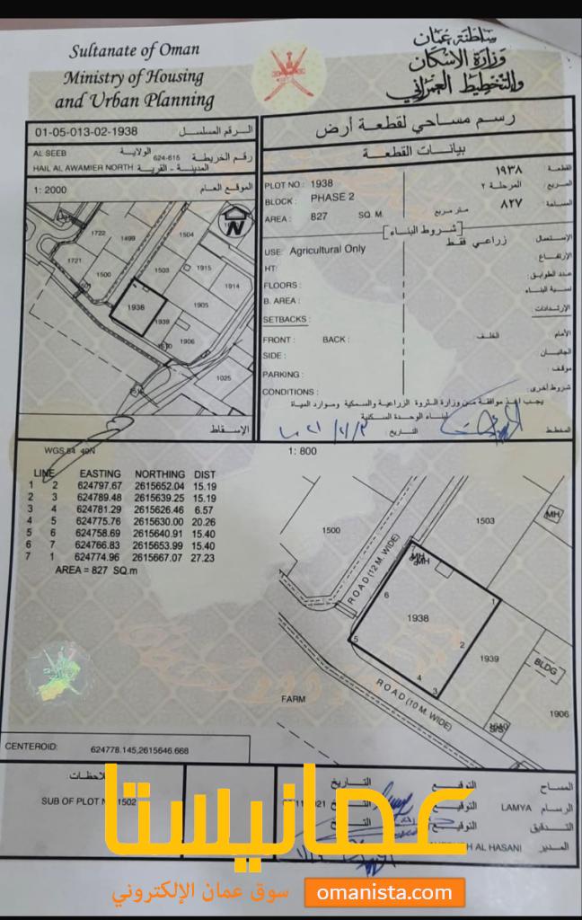 ارض كونر للبيع زراعيه الحيل الشماليه مساحة 827 متر | سوق عُمانيستا 2026