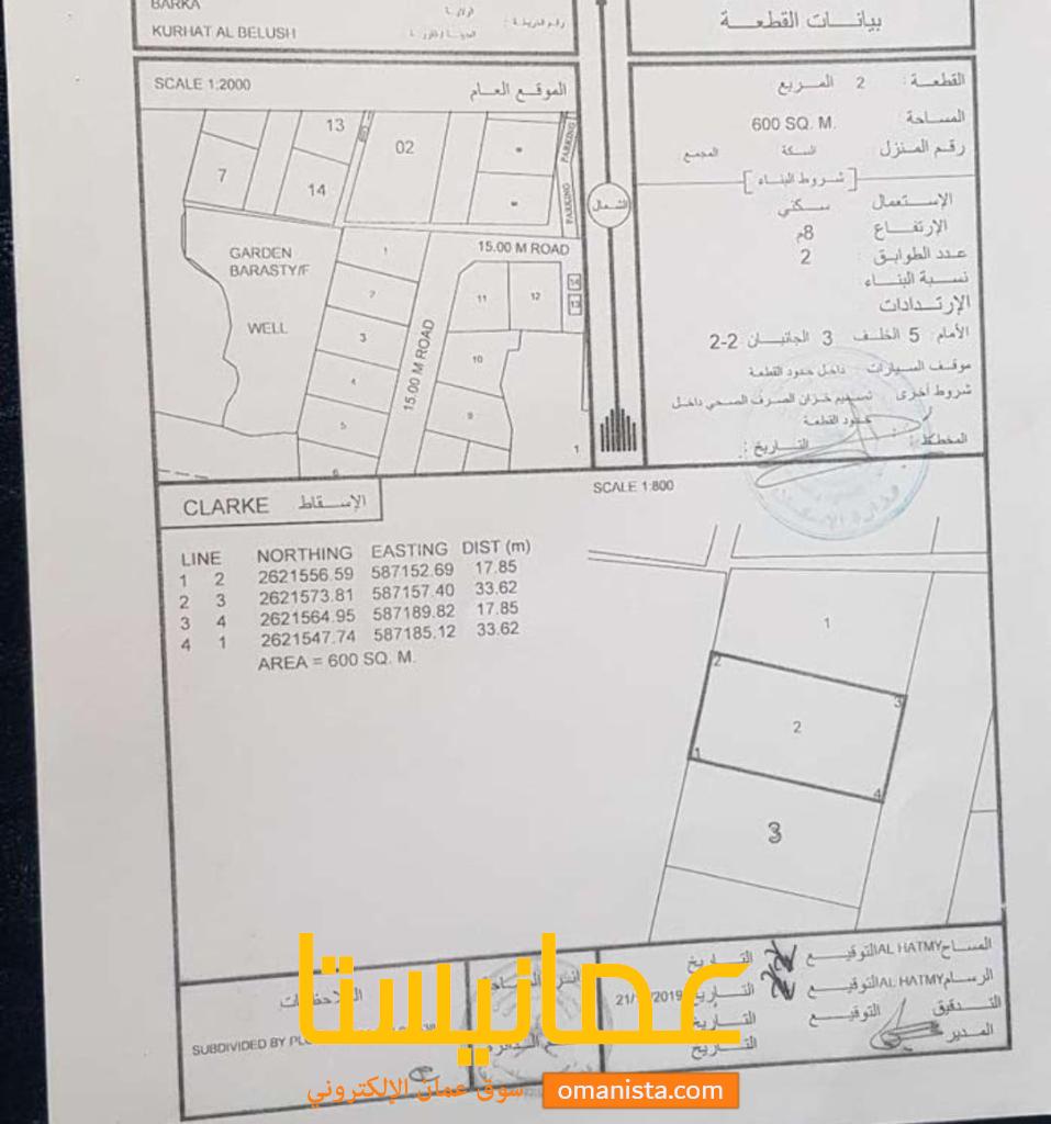 للبيع ارض سكنية ممتازة في بركاء قرحة البلوش ، رقم القطعة (2) .