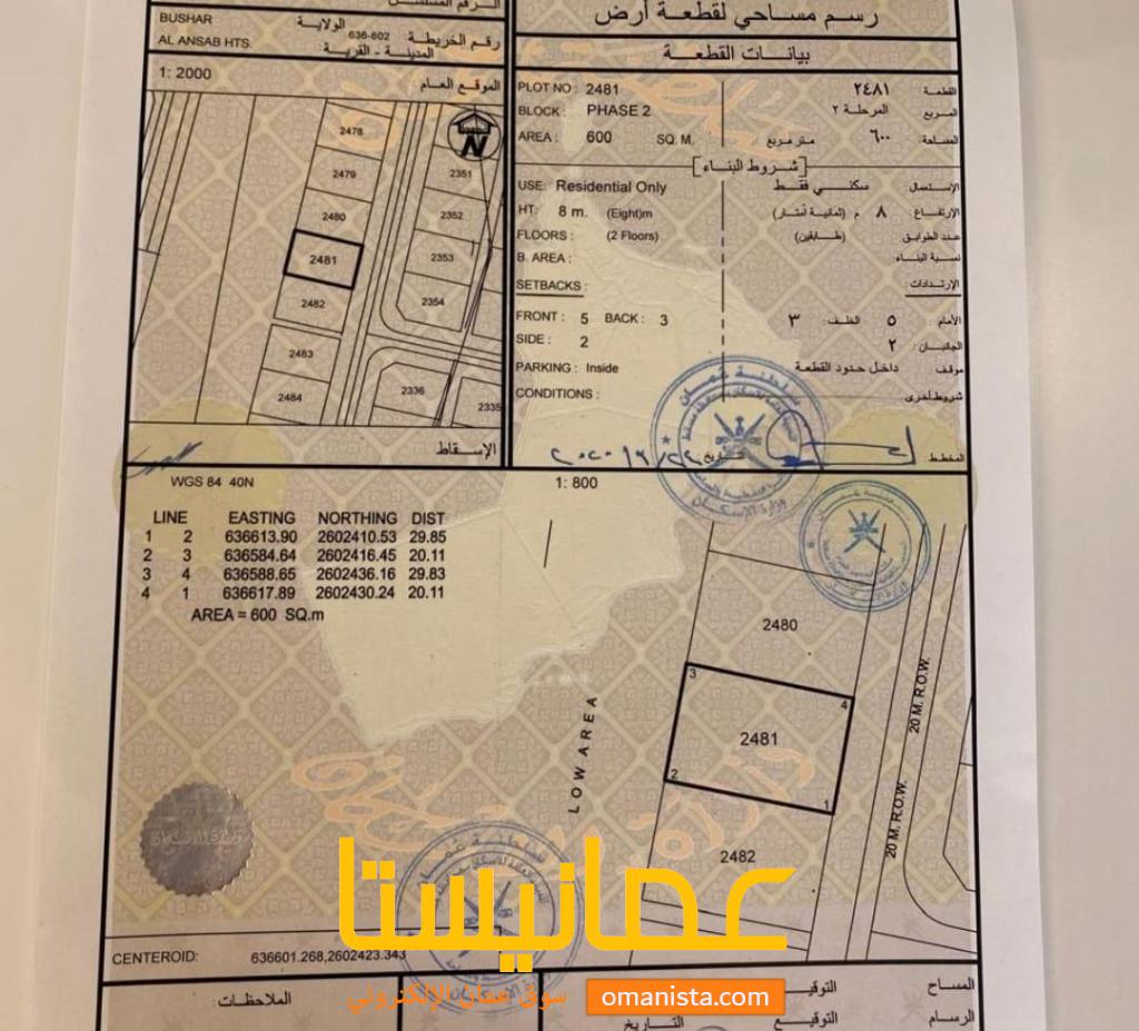 للبيع أرض سكنية مميزة في بوشر فلج الشام ، رقم القطعة (2481) .