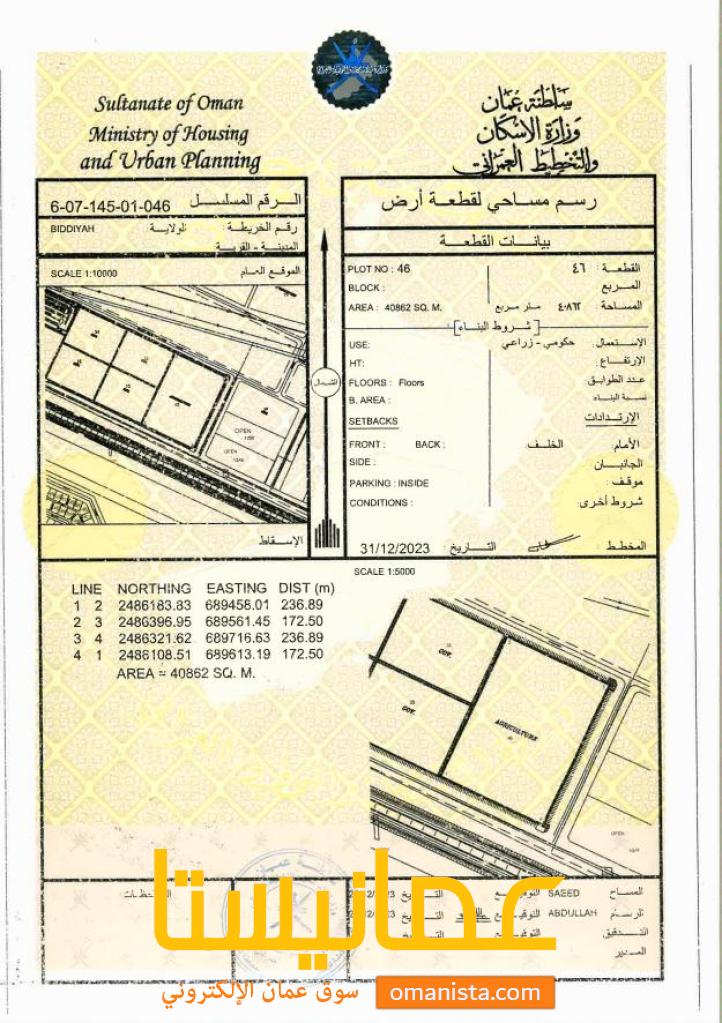 للبيع ارض زراعية مميزة بعقد الانتفاع في ولاية بدية ، رقم القطعة (46) .