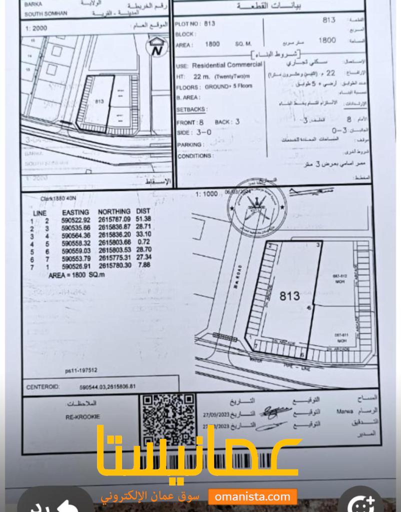 للبيع ارض سكنية تجارية ممتازة في بركاء الصومحان جنوب ، رقم القطعة (813) .